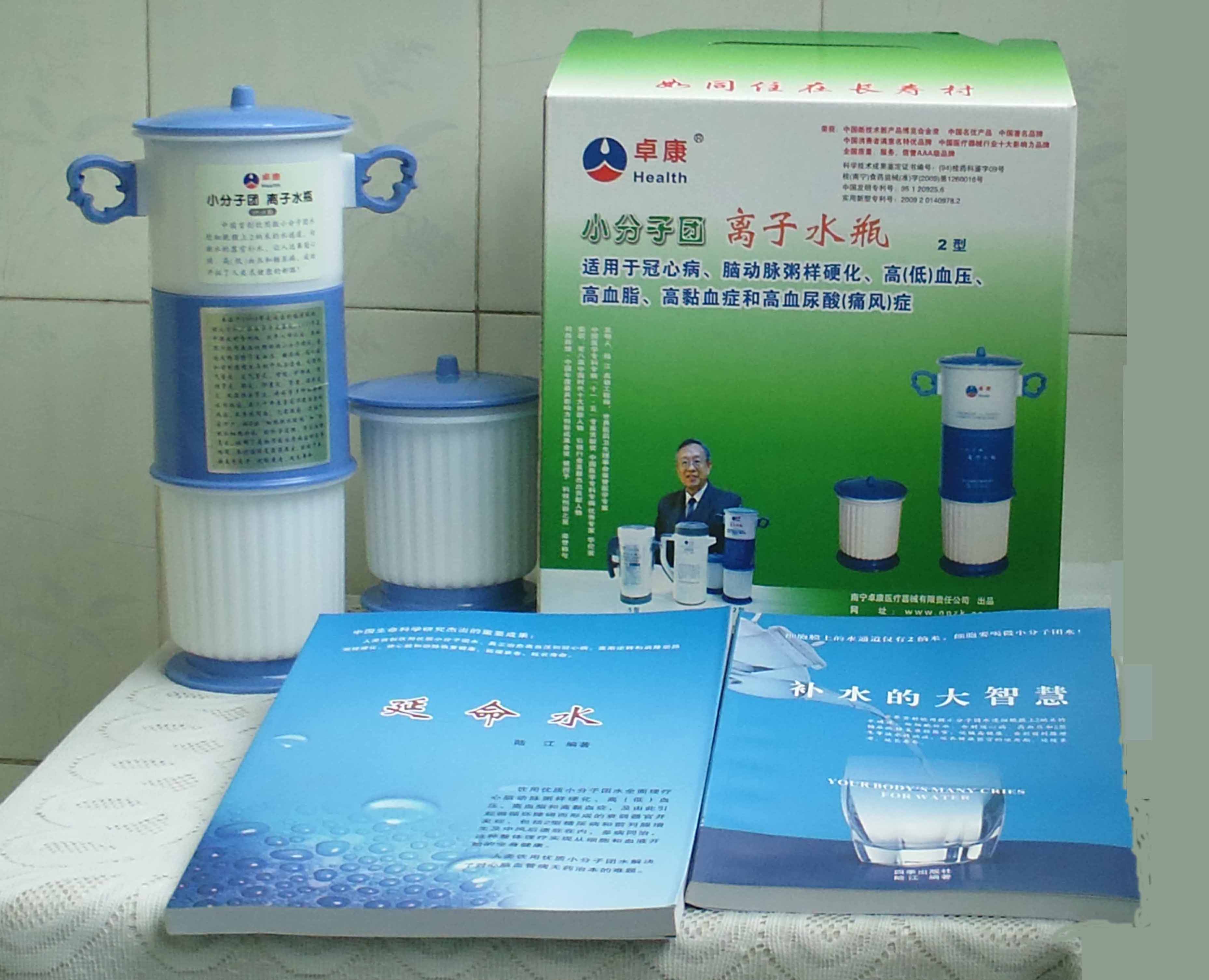 本品大量用戶的使用效果表明,能治愈冠心病、腦動脈硬化、原發性高(低)血壓、高血脂、高粘血癥、高血尿酸癥(痛風)和2型糖尿病、衰弱器官并發癥(前列腺增生、腎衰與尿毒癥)及中風后遺癥等療效好。產品配信譽卡。使用壽命30年,不換芯,易清洗。團購優惠。從郵局匯款,匯費1%,地址按本頁下方地址、聯系人寫。從銀行匯款,請點擊[聯系匯款]從工商銀行匯款,建設銀行、農業銀行匯款,均免收匯費,匯款后20--30分鐘內發短信,可用微信轉帳,均免匯費,微信號即手機號13768308380。匯款后,告知你的姓名和地址,我公司聯系人手機號是:13768308380。卓康牌離子水瓶為我公司獨家生產,郵購產品配《補水的大智慧》彩印書一本,另配四季出版社出版的新書《補水的大智慧》一本,并配光盤一張(含央視主持人釆訪陸江的對話視頻)。目前市場和"淘寶網"上有人兜售假冒的偽品,望讀者審察辯別真偽,造假者剽竊假冒本公司的各種認證、獲獎獎項、專利號和外包裝盒上的中英文字,包括科技成果的鑒定意見等,請讀者注意防偽。如何識別假貨?已經買了假貨怎么辦?(請點擊[打假掠影][打假掠影])。